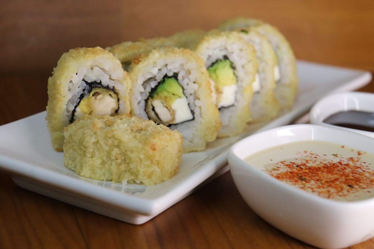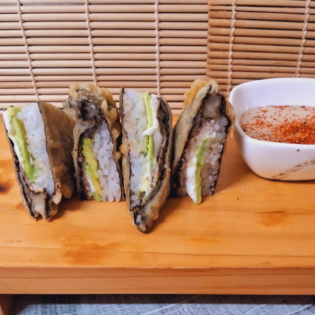 Relleno de pescado del día en salsa spicy, palta y queso crema, el nori va por fuera y es frito. Elige la salsa que más te guste.