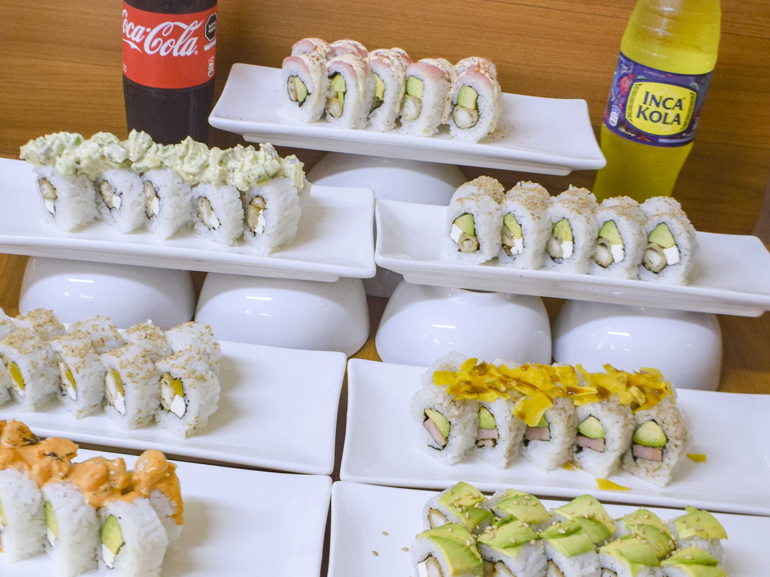 70 Piezas de makis promoción elige solo 7 tipos, 9 salsas a elección, 4 pares de palitos y 2 bebidas de 500 ml.No se permiten cambios, los adicionales tienen costo.