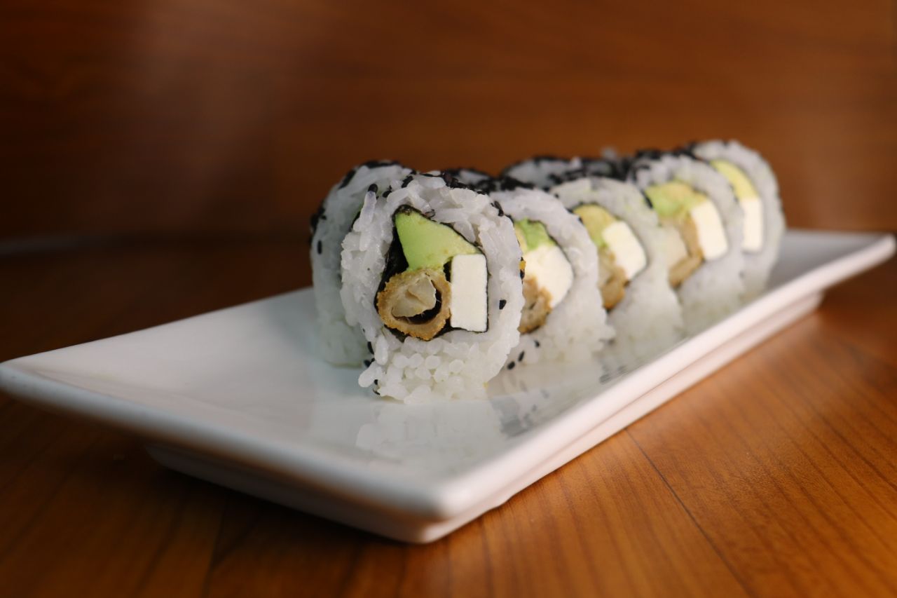 Relleno de palta, zanahoria y kiuri. Cubierta de mix de ajonjolí blanco y negro.
