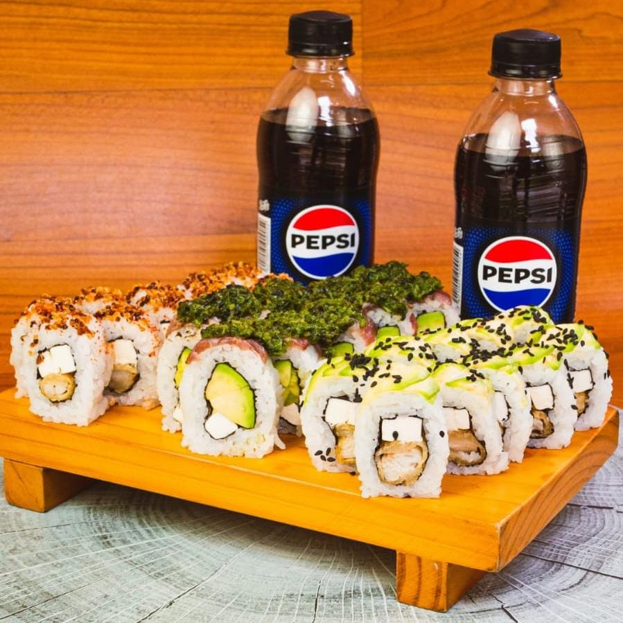 30 Piezas de makis promoción elige solo 3 tipos, 4 salsas a elección, 2 pares de palitos una bebida de 500 ml. No se permiten cambios, los adicionales tienen costo.