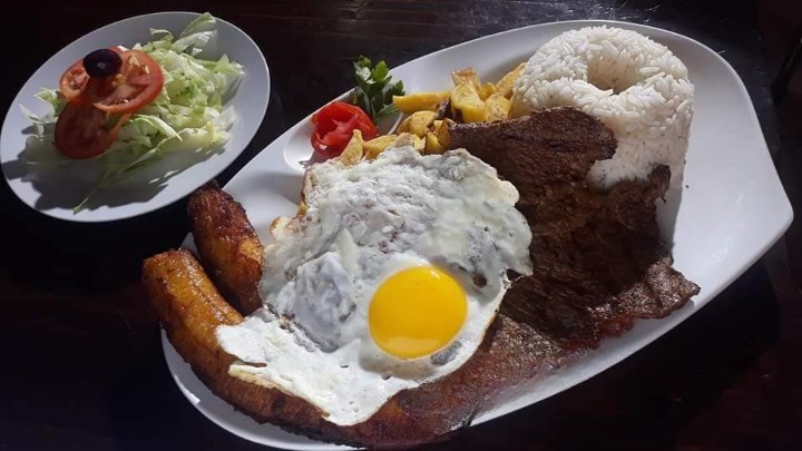 Bistec a la parrilla de 200 g aproximadamente, acompañada de papas fritas huamantanga , arroz graneadito, plátano y huevo frito.