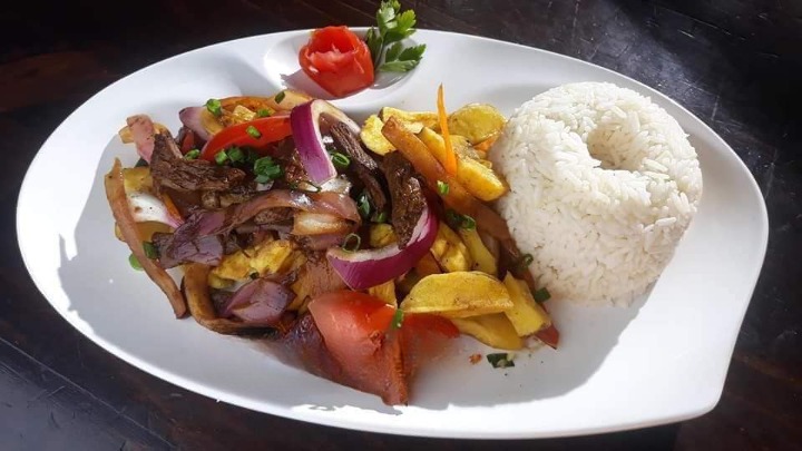 Lomo saltado de res de 200 g aproximadamente, acompañado de papas fritas huamantanga y arroz blanco.