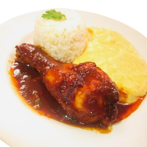 Pollo al horno con puré, arroz con opción a adicionar bebidas y entrada.