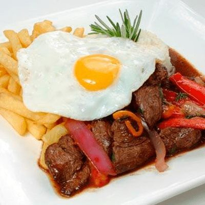 Lomo saltado flameado y ahumado con huevo y plátano frito con opción a adicionar bebidas y entrada.