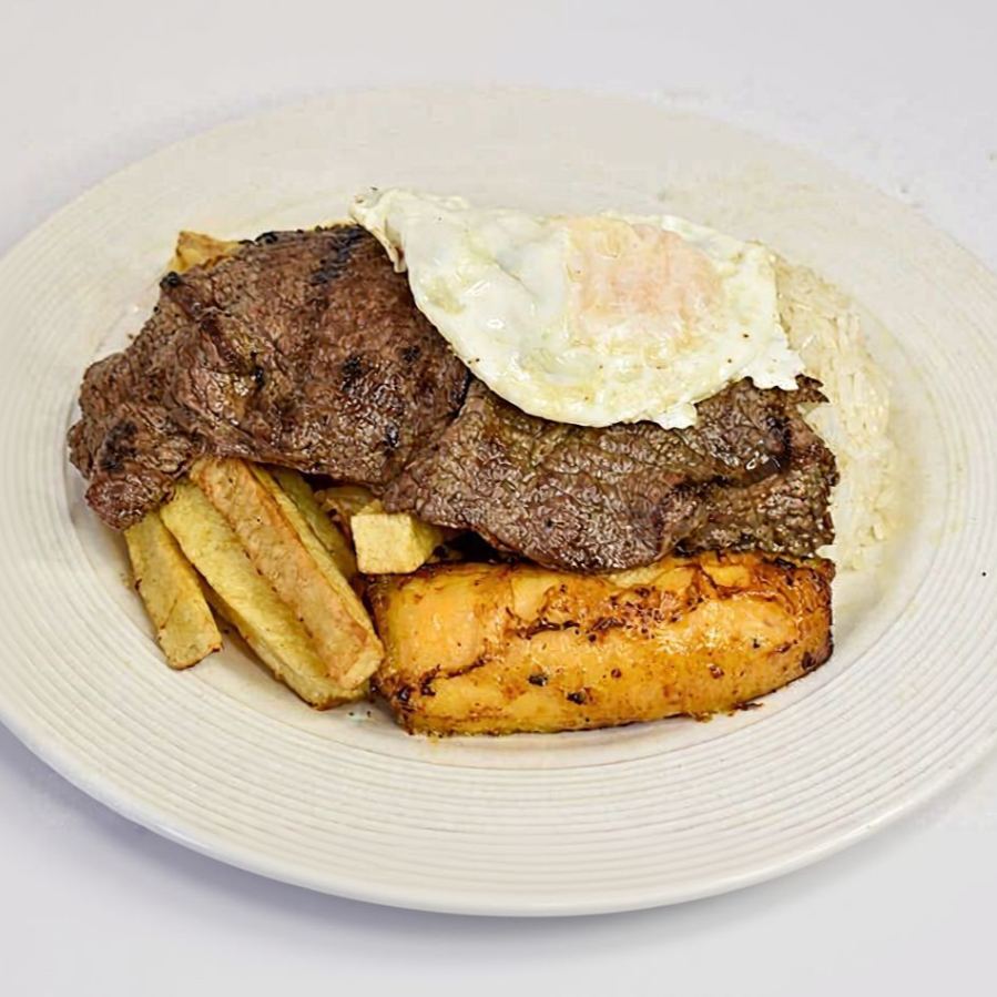 A lo pobre con proteína, acompañado de huevo, plátano frito y arroz. con opción a adicionar bebidas y entrada.