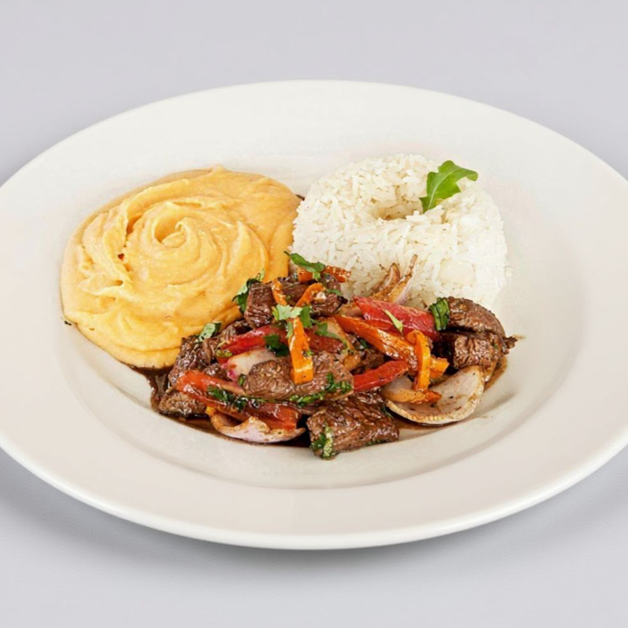 Puré de papa con jugoso lomo saltado.