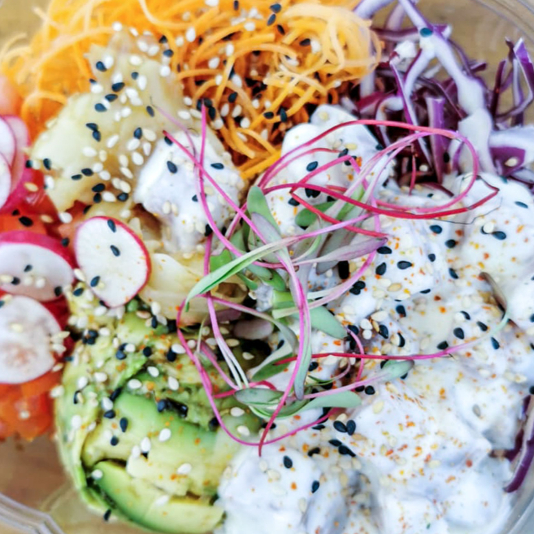Mix de verduras, palta, pollo al panko y chalaquita.