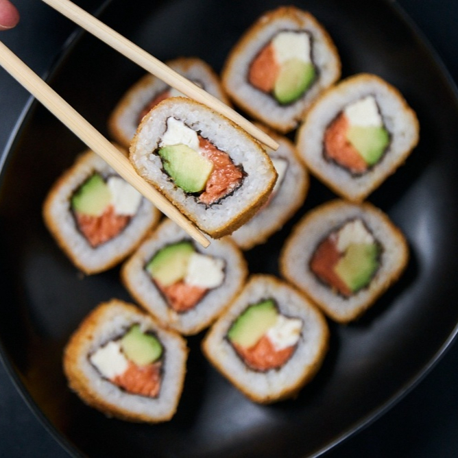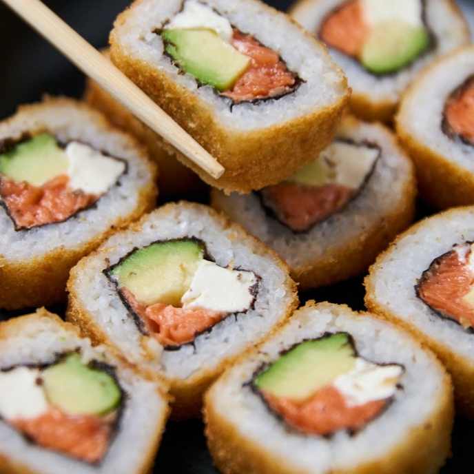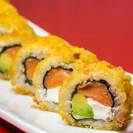 Salmón, queso crema, palta, envuelto en arroz frito.