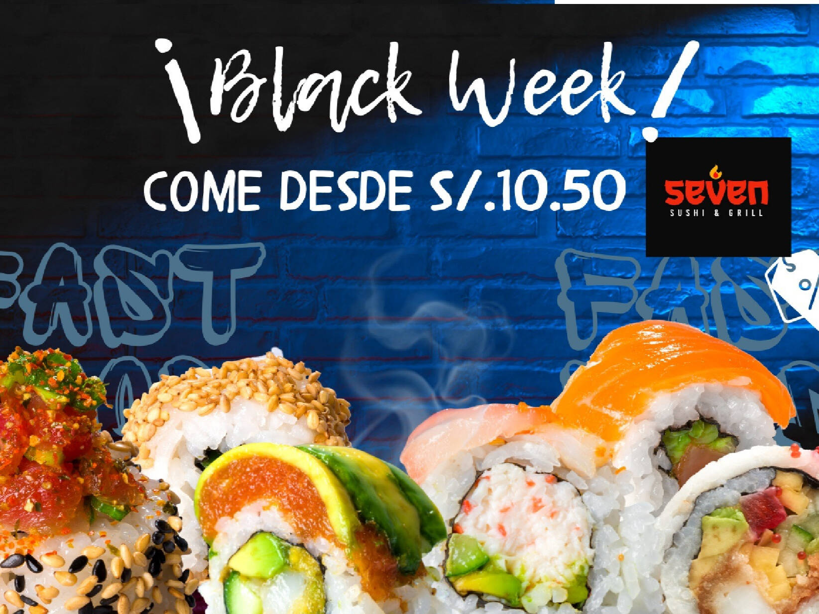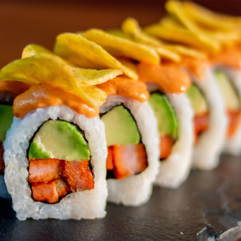 Empanizado, palta, cebolla china, envuelto en arroz, cubierto de salmón flameado, salsa de ají amarillo, topping de ceviche y chips de yuca.