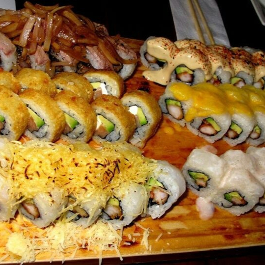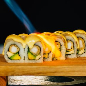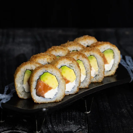 Empanizado, palta, envuelto en arroz, cubierto de queso crema flameado con chimichurri nikkei.