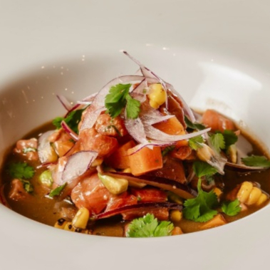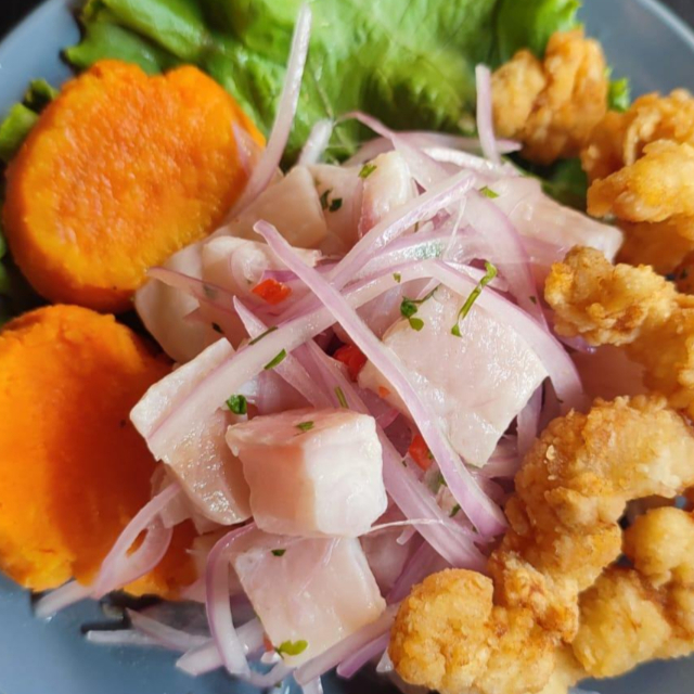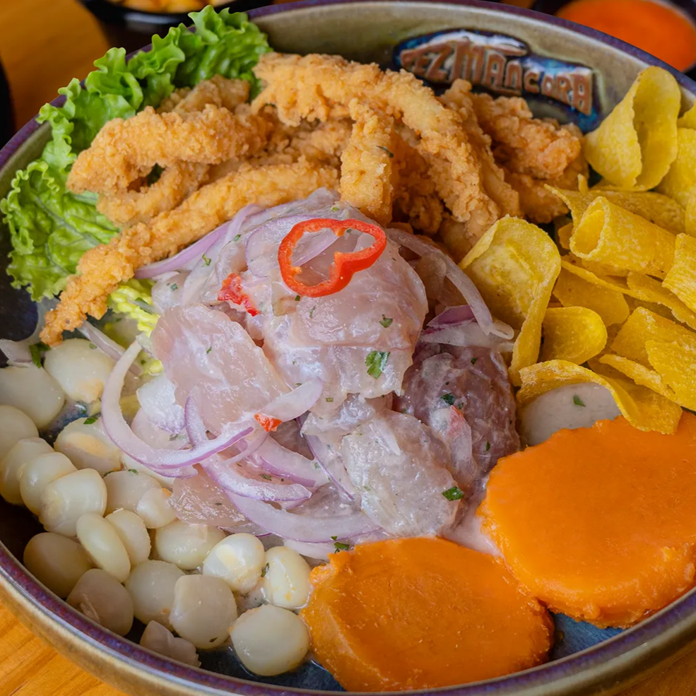 Pescado del día, leche de tigre a base de soya y ajonjolí, chicharrón de pescado o calamar, toppings de chifle, canchita y camote.