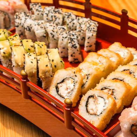 Empanizado, queso, envuelto en arroz, cebolla china, palta flameada, salsa baby, salsa parrillera, topping chimichurri nikkei.