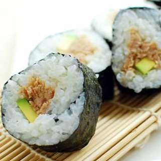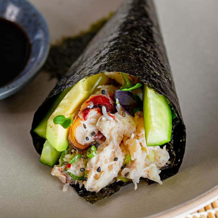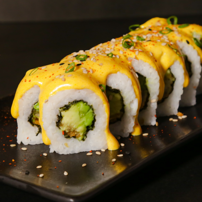 Atún, lechuga, palta, envuelto en alga nori y salsa spicy.