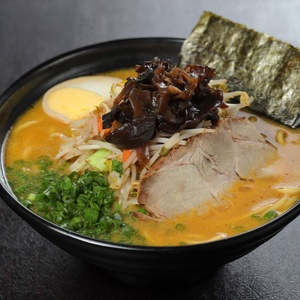 Pasta ramen artesanal, shiitake ahumado, chicharrón de pescado y huevo cocido.