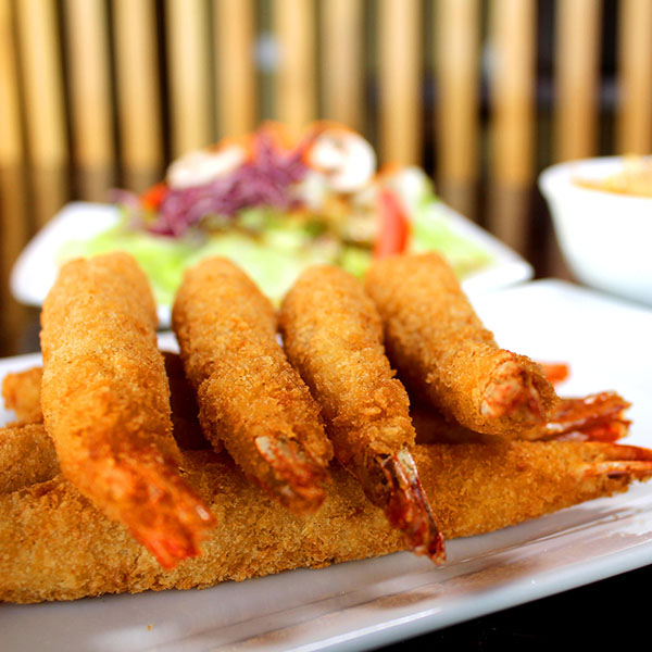 Langostinos jumbo empanizados al panko con ensalada nikkei.