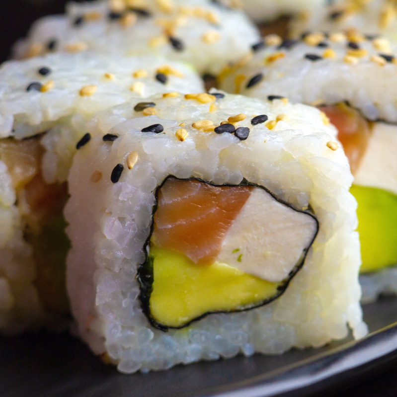 Salmón, queso crema, palta, envuelto en arroz, cubierto de ajonjolí mix.