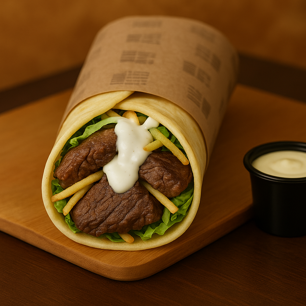 Carne de res sazonada, lechuga fresca y papas al hilo, todo envuelto en pan árabe con cremas a elección.