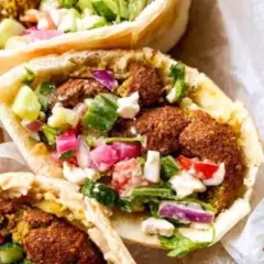 Croquetas de garbanzo y habas molidos, fritos, ensalada, pan árabe y salsa árabe.