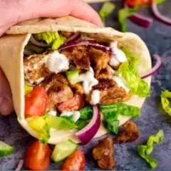 Láminas de pollo asado con especies árabes, cremas árabes, pan árabe y ensalada.