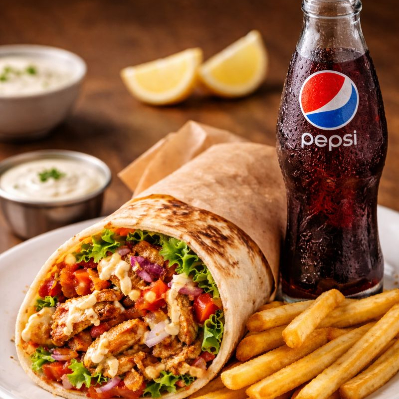 Shawarma de pollo con ensalada fresca, crema árabe,una con ensalada fresca, crema árabe, papas fritas, gaseosa personal