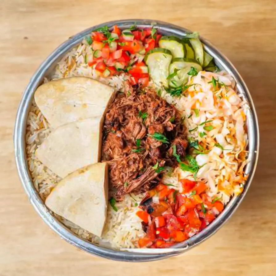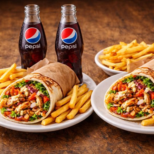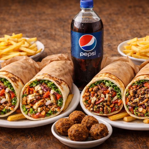2 Shawarma de pollo, 2 de carne, ensalada, crema árabe, papas familiar, porción de Falafel y gaseosa de 1.5 L.