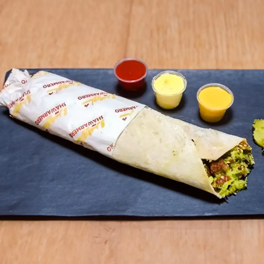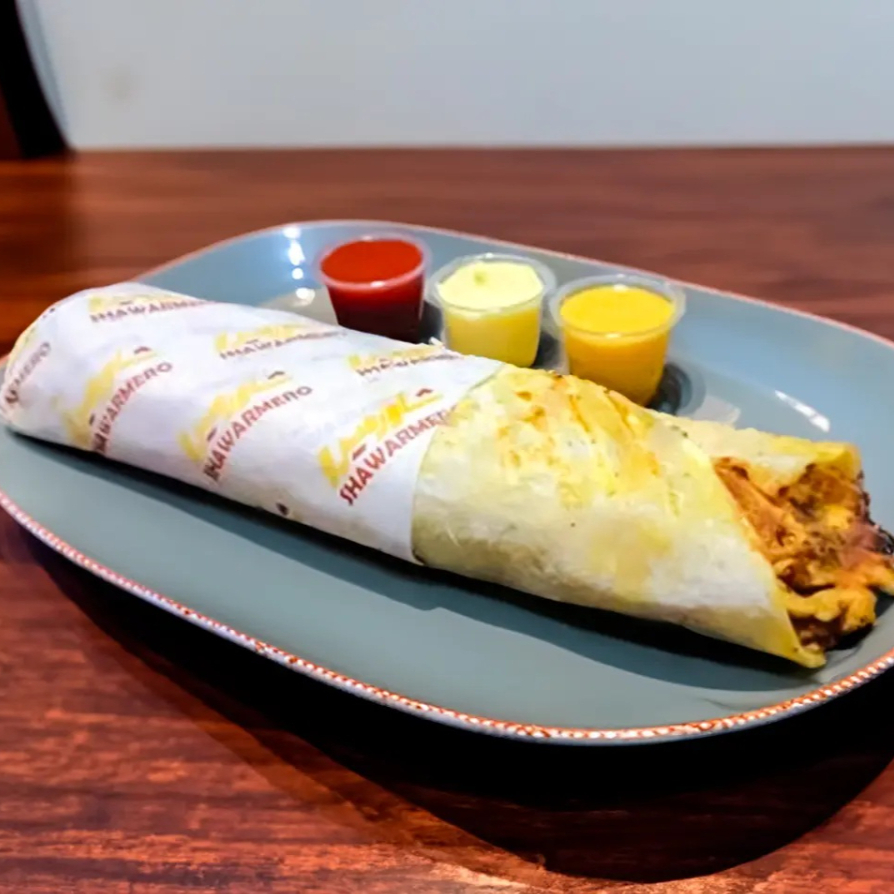 Enrollado en pan árabe con Jugoso corte fino de pollo Y carne, ensalada fresca y crema árabe.