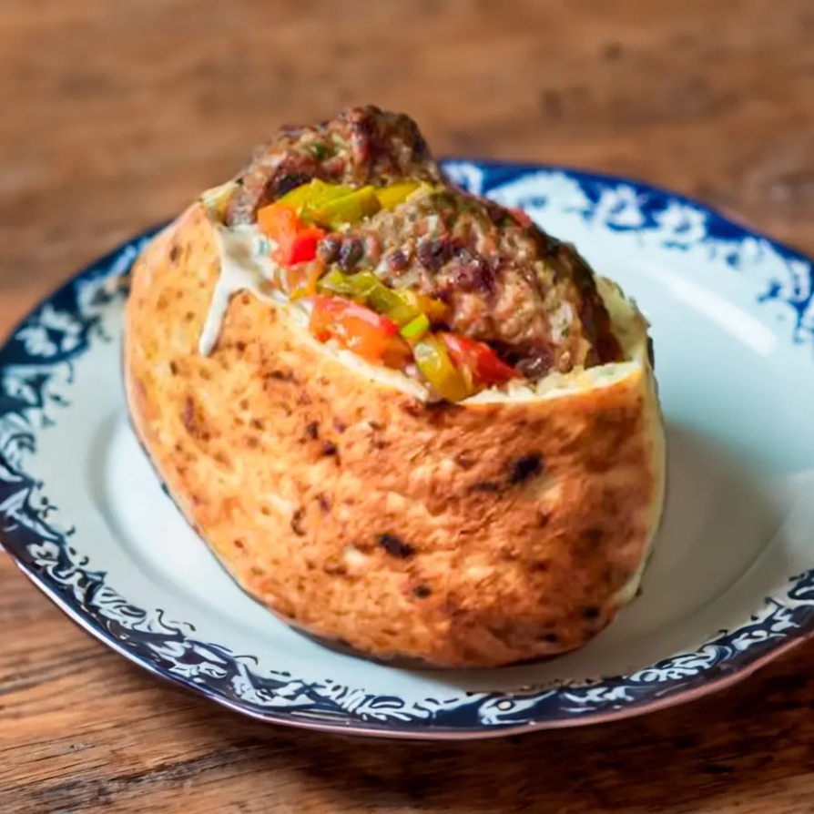 Pan pita con Jugoso corte fino de carne, ensalada fresca y crema árabe.