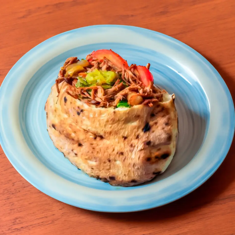 Enrollado en pan árabe con Jugoso corte fino de carne, ensalada fresca y crema árabe.