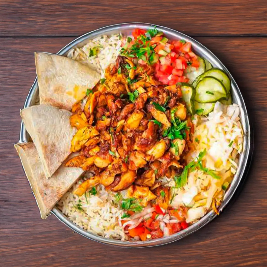 Pan pita con Jugoso corte fino de pollo y carne, ensalada fresca y crema árabe.