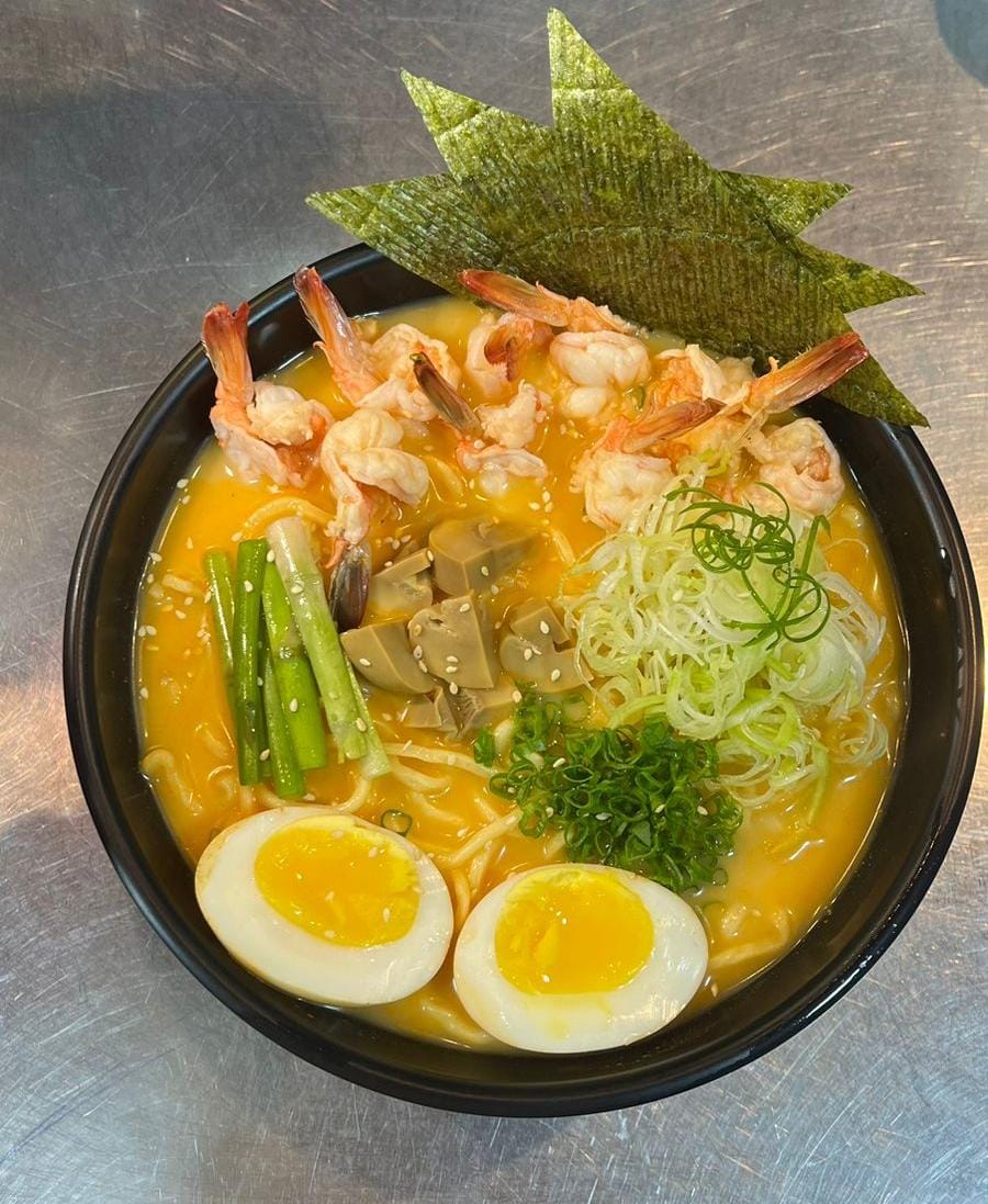 Sabor como en casa. Ramen de langostinos con cariñito peruano, acompañado de nuestros fideos artesanales y complementos.