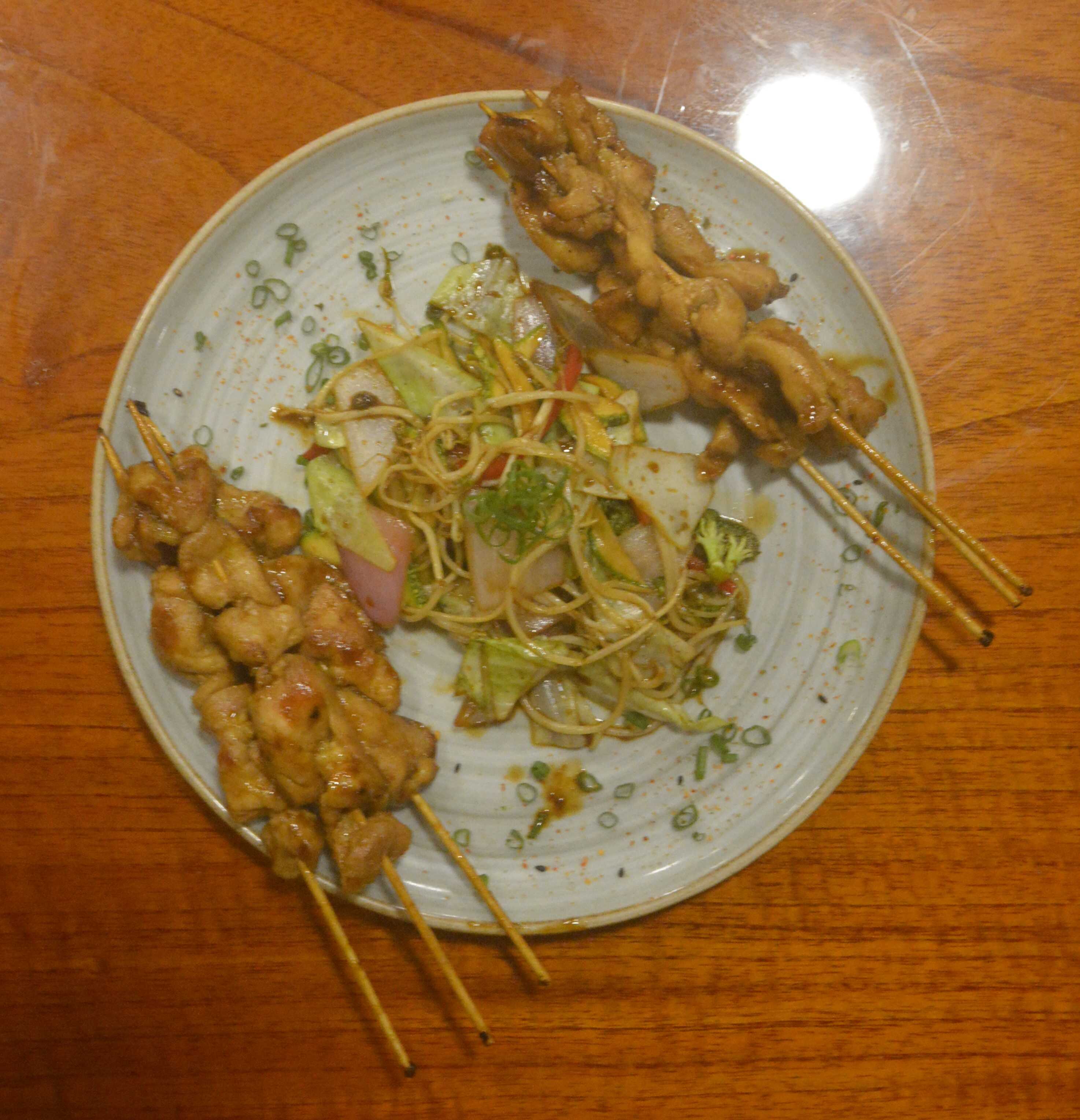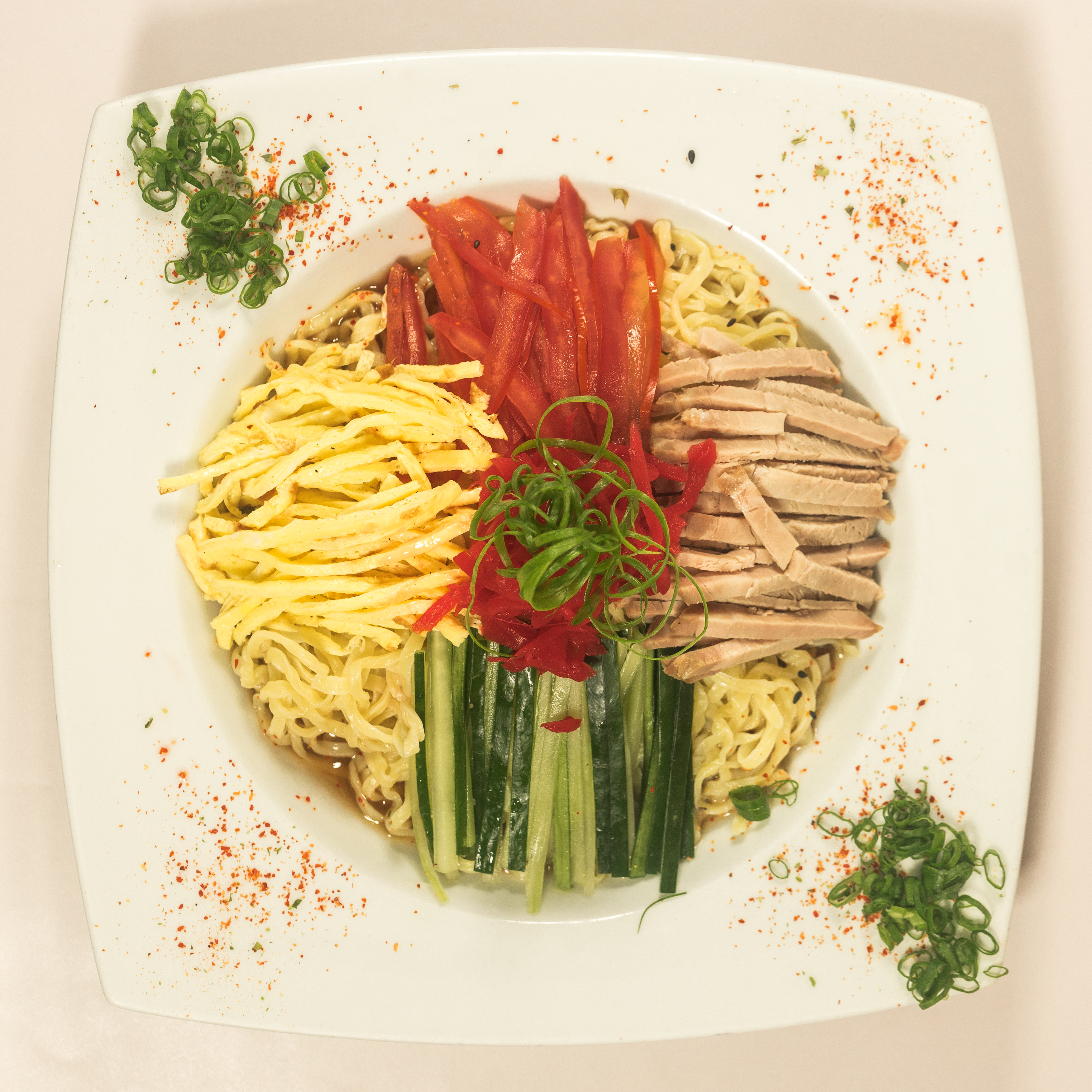 Tradicional y refrescante plato japonés de fideos ramen fritos, cortes finos de pepino, tomate, tortilla de huevo y chancho asado en salsa de la casa.