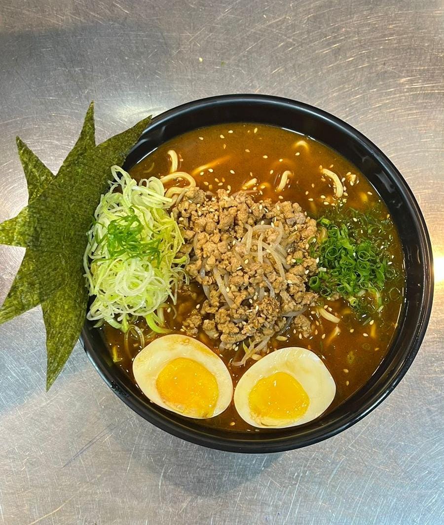 Ardiente como nuestro sol naciente. Ramen picante acompañado de verduras, huevo en su punto, chancho molido, fideos artesanales y complementos.