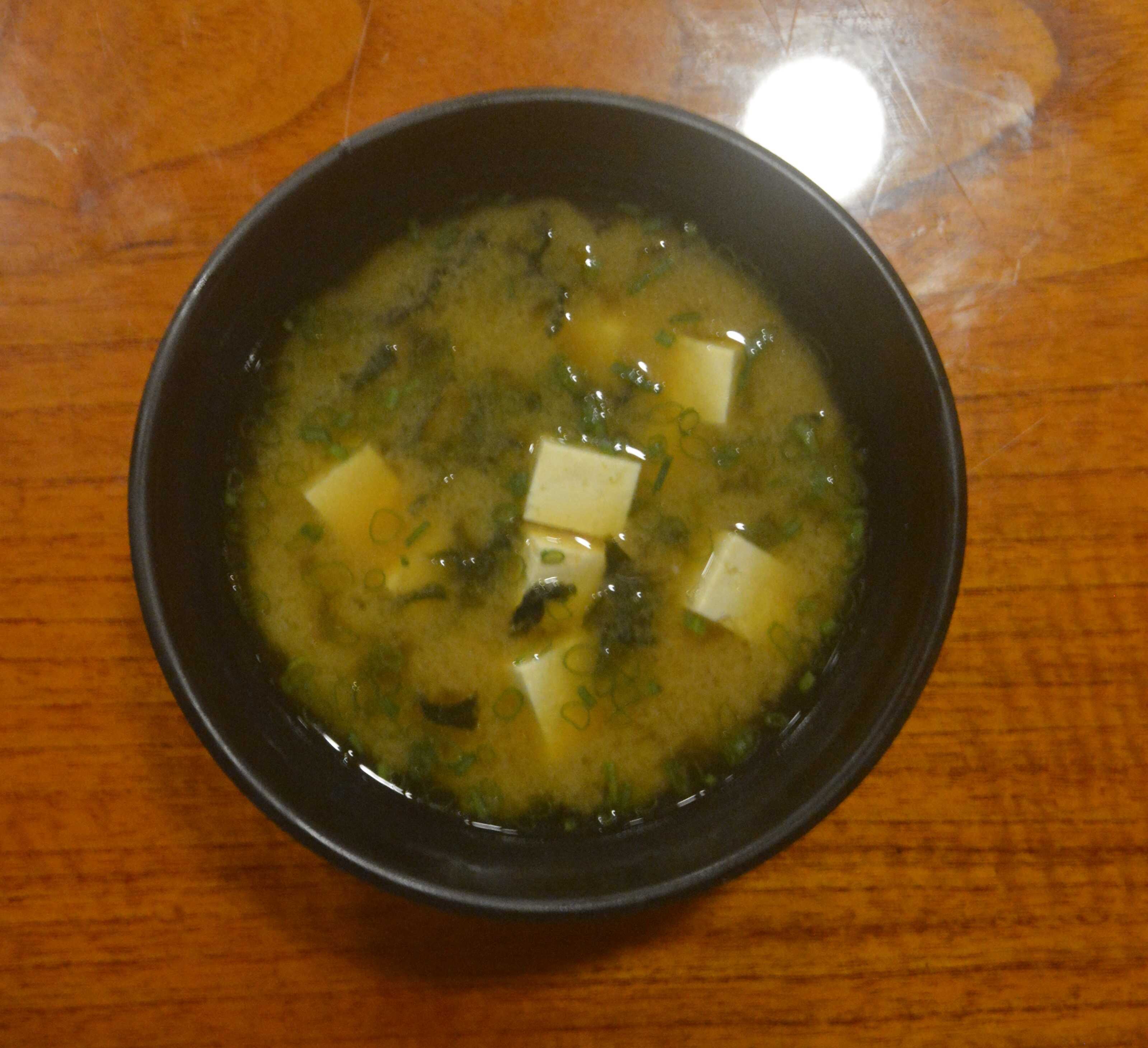 Tradicional caldo japonés a base de miso acompañado de algas wakame y tofu en cubos.