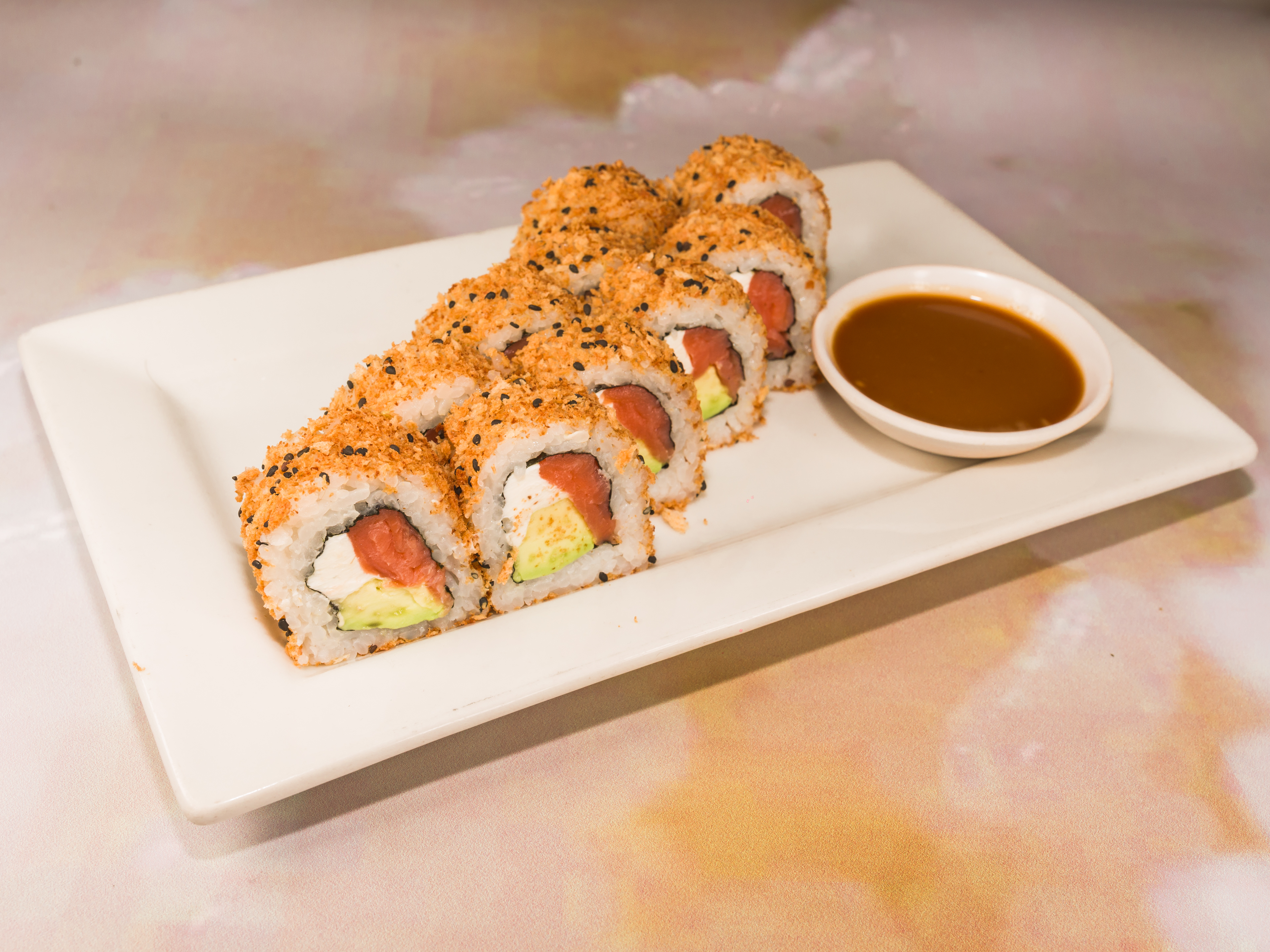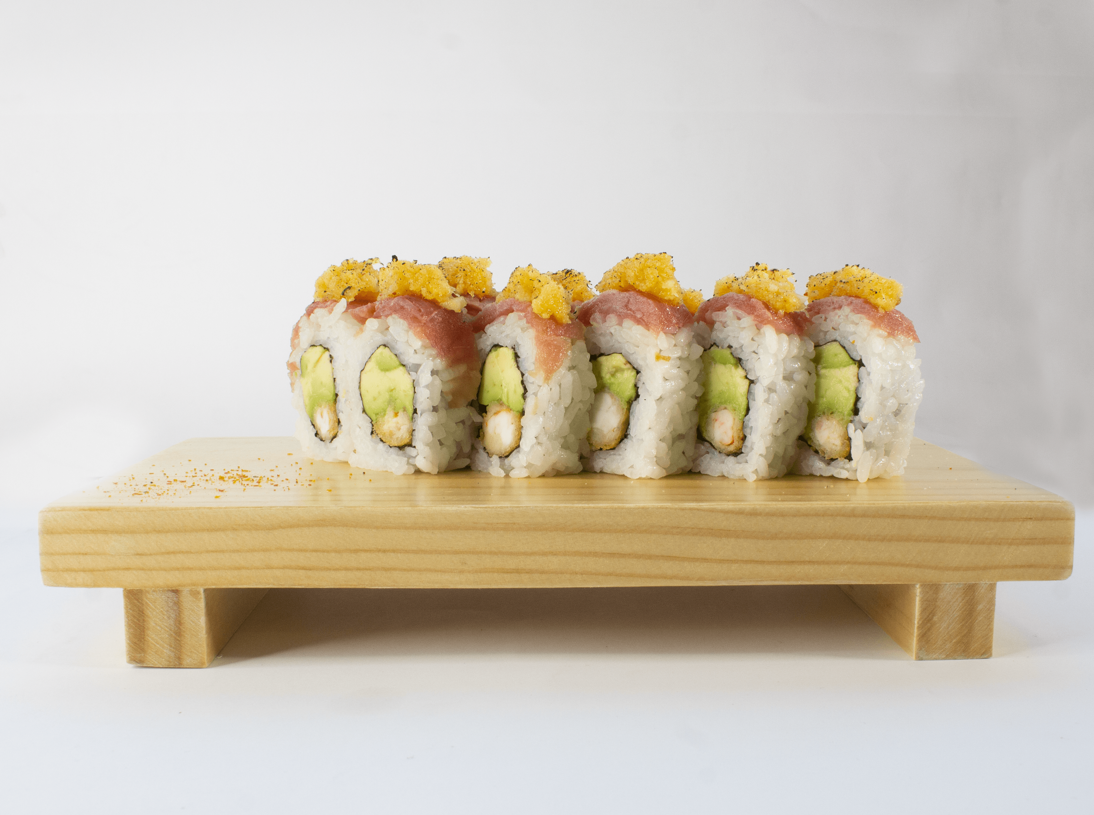Relleno de palta y langostinos. Cubierto con atún y una salsa de ostión con toques de ajonjolí.