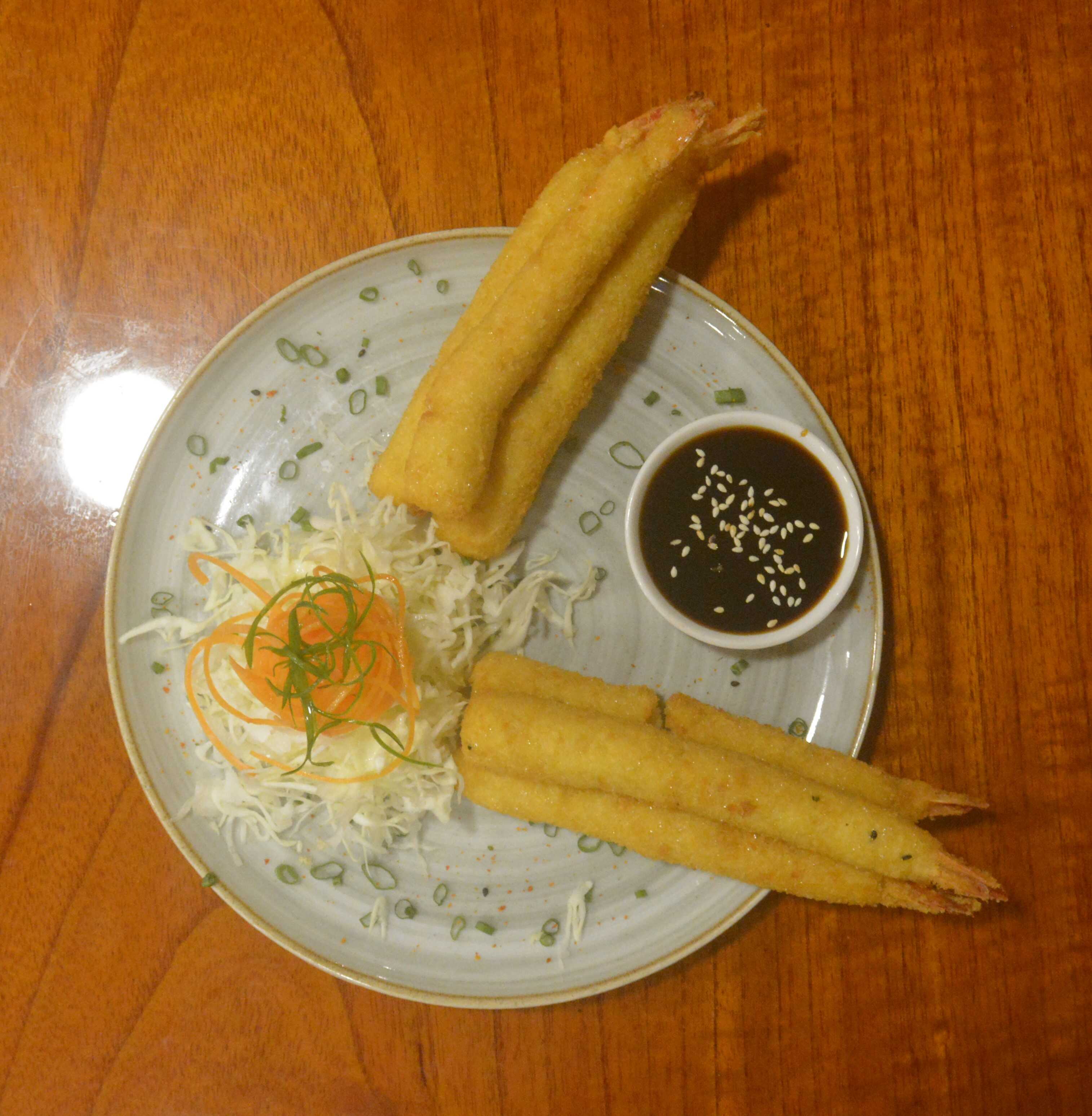 Langostinos al panko y palta, cubierto con láminas de pescado y coronado con una salsa de kión, ajo y cebolla china.