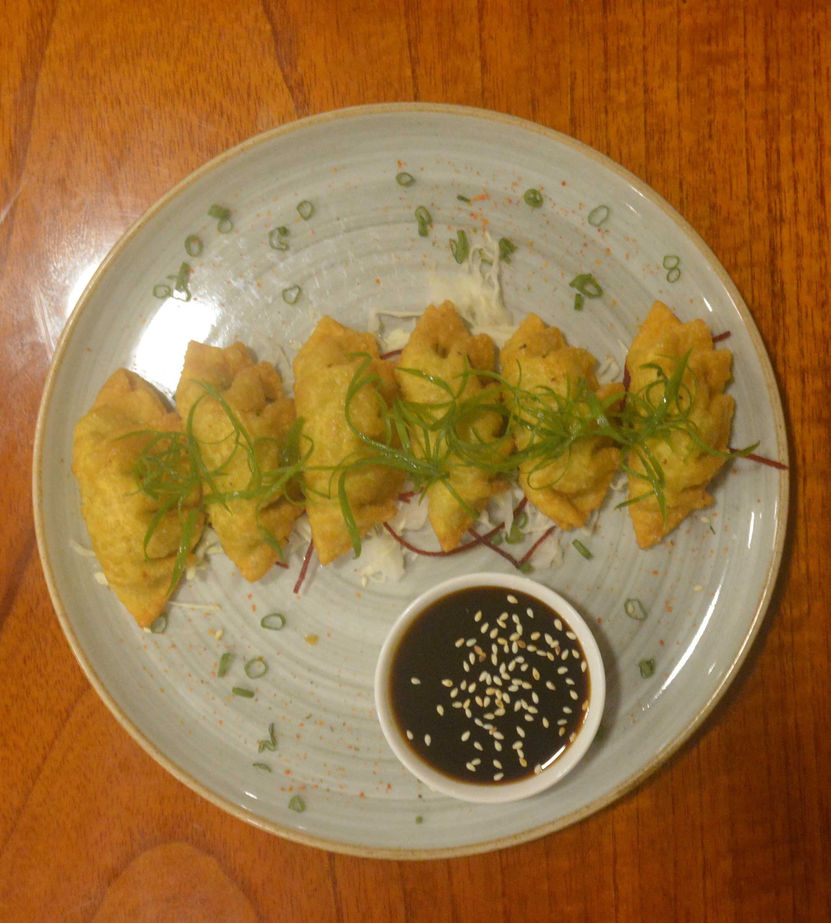 Relleno de atún y conchas de abanico espolvoreado con togarashi y acompañado de salsa cítrica y picante.