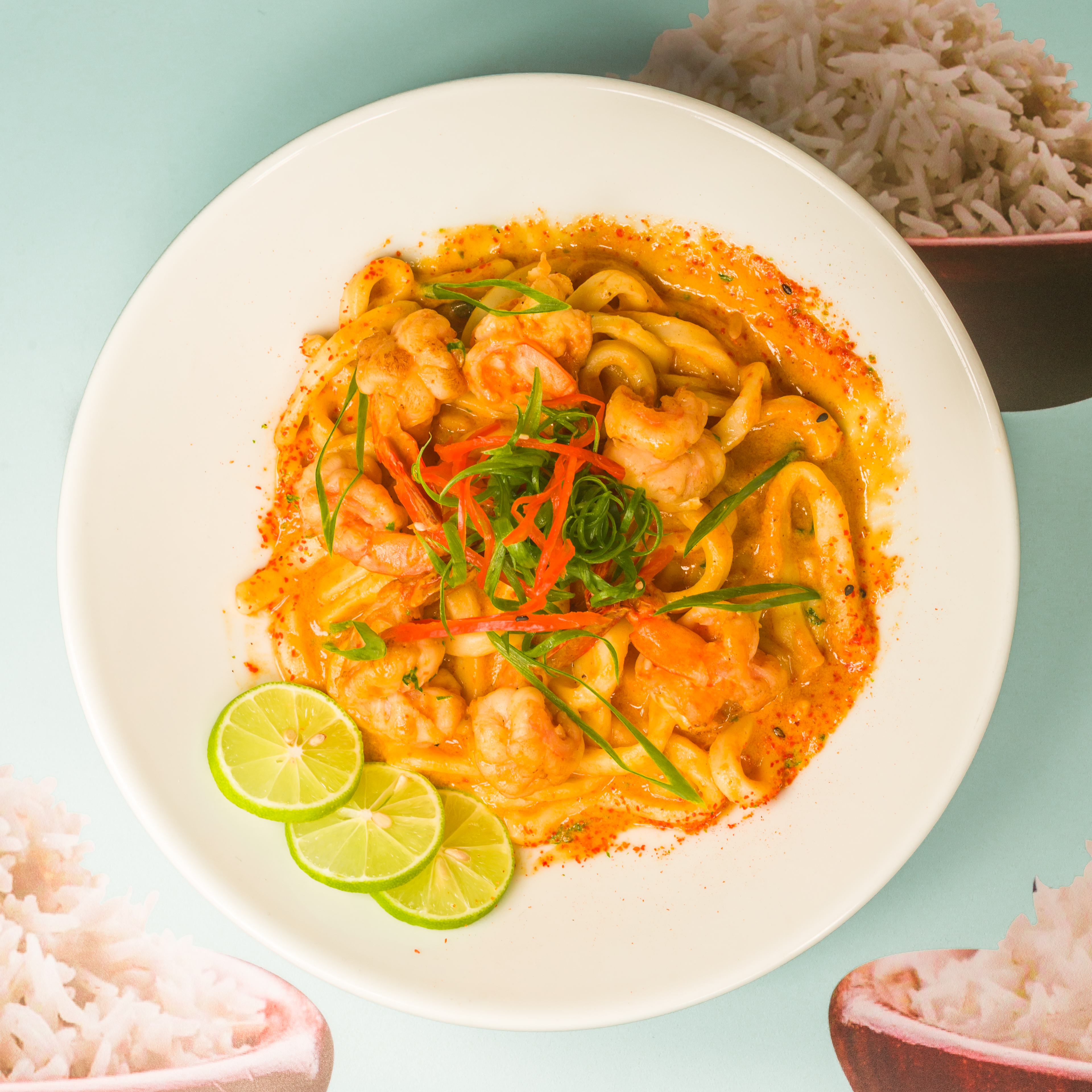 Fusión peruano japonesa de fideos udon en salsa de langostinos con toques de limón.