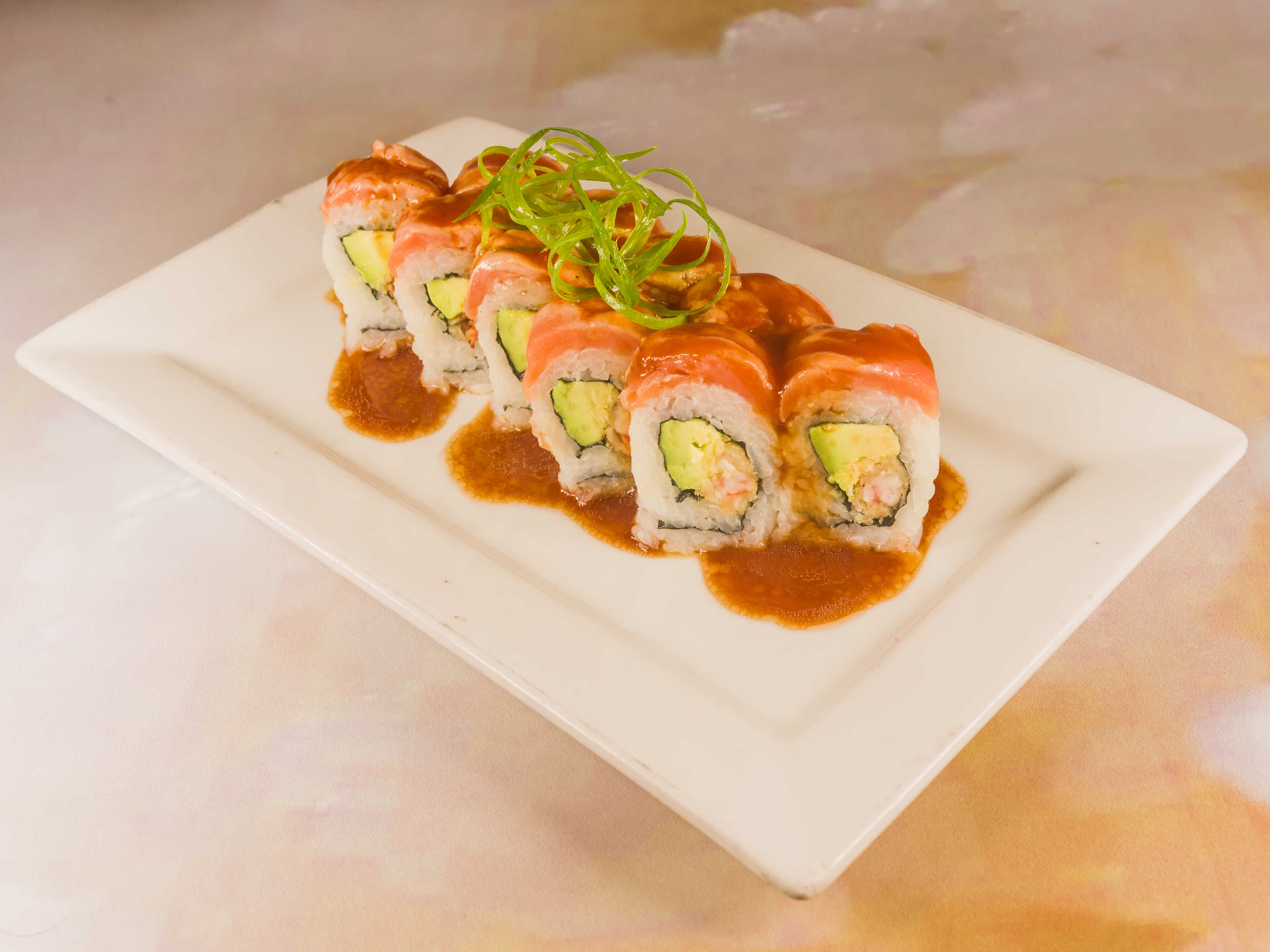 Relleno de palta y langostinos cubierto de salmón con una salsa de ají amarillo.