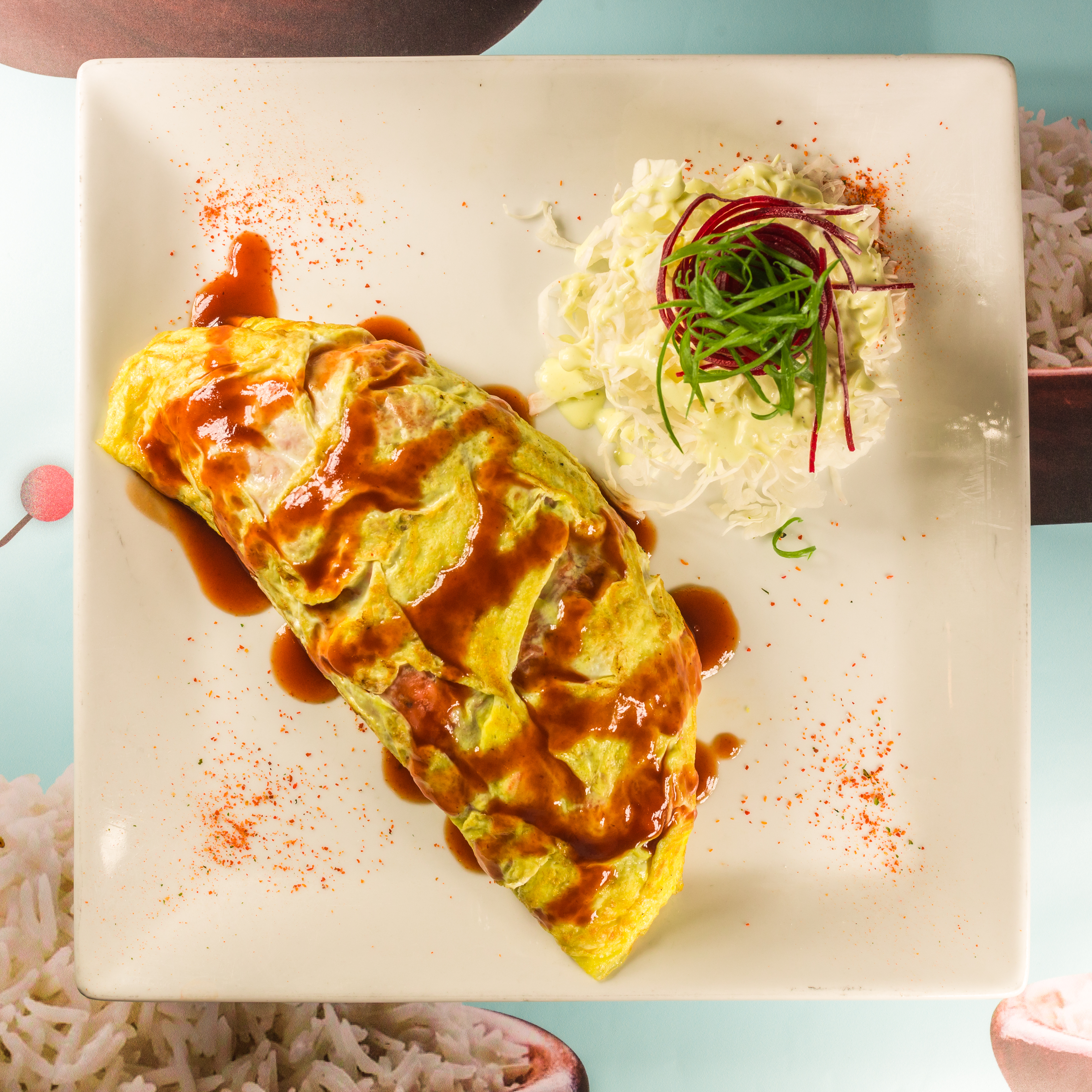 Pollo, holantao, zanahoria, salteados con arroz y salsa katsu, presentado en una tortilla.