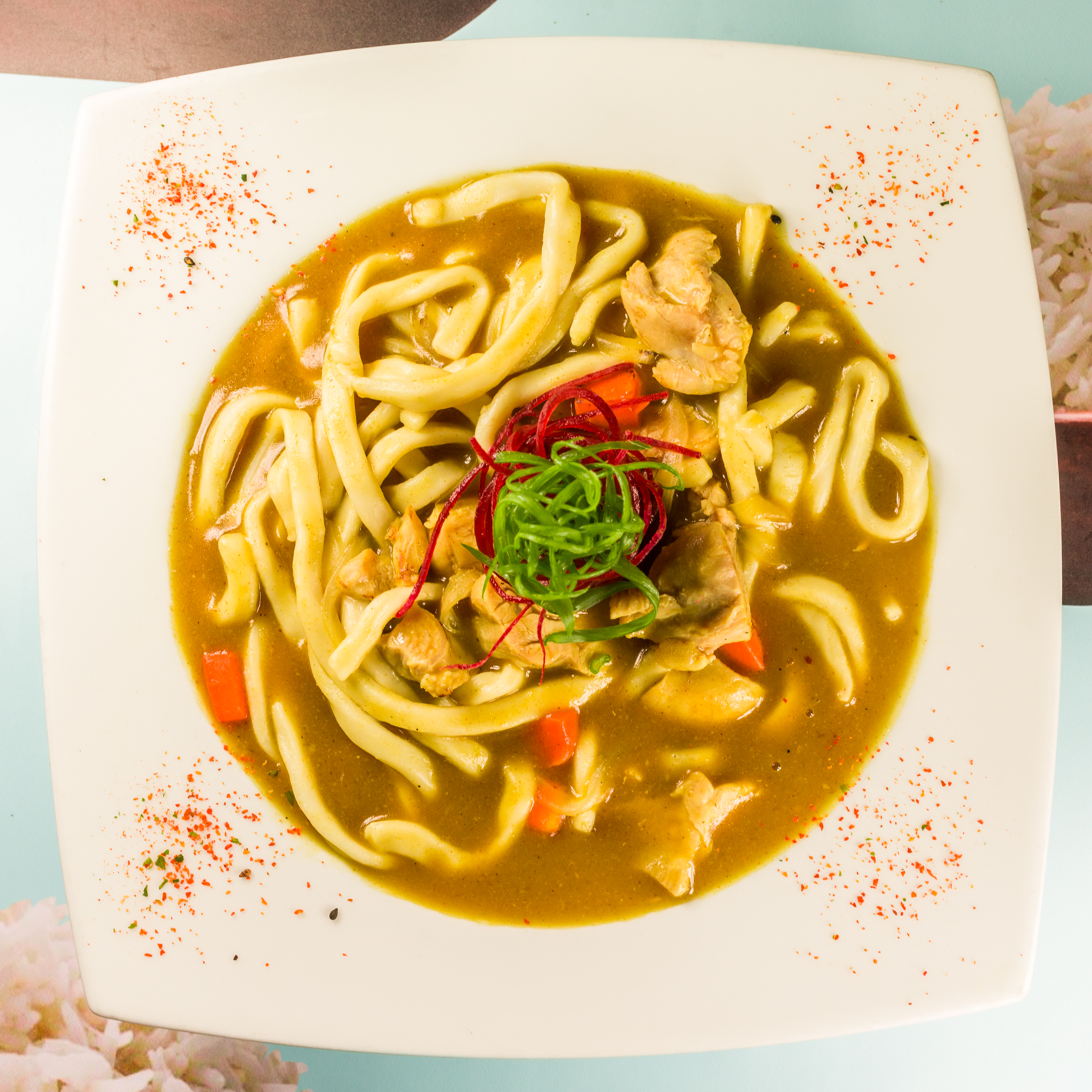 Fideo Udon con trozos de pollo en abundante curry japonés.