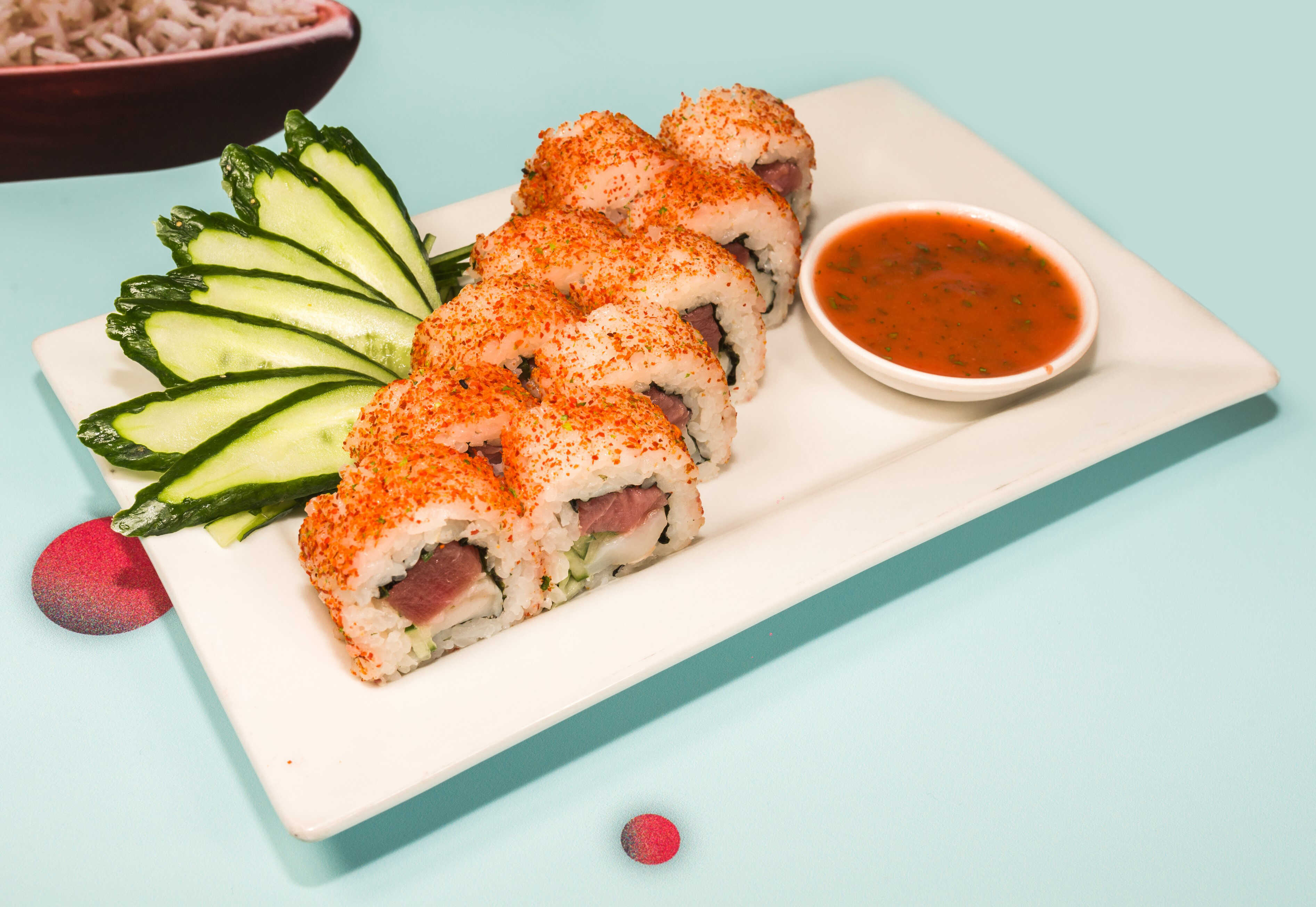 Langostino al panko y palta de relleno cubierto con láminas de pescado y flameado con salsa dulce y picante.