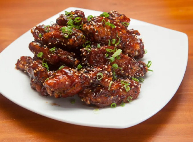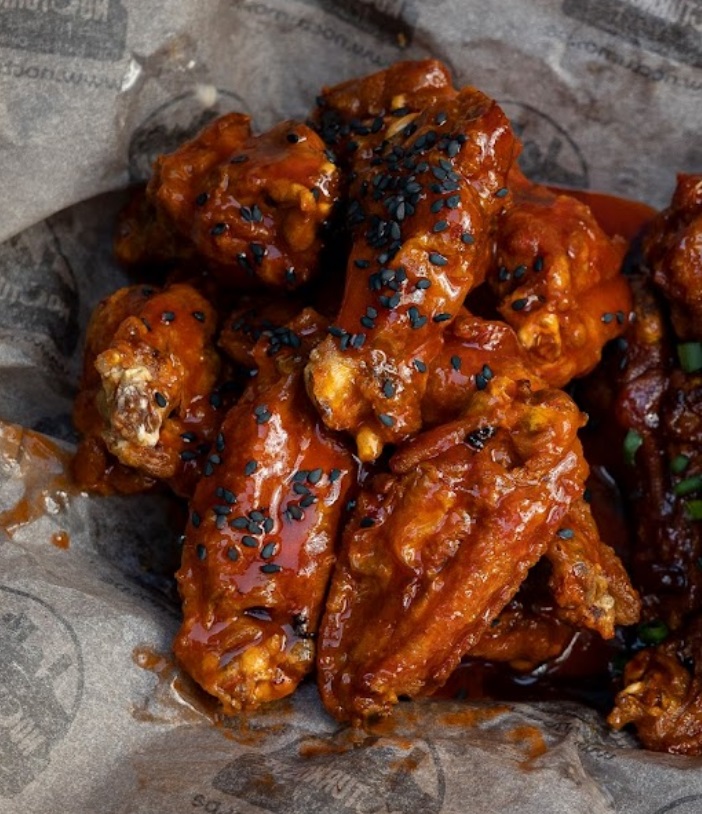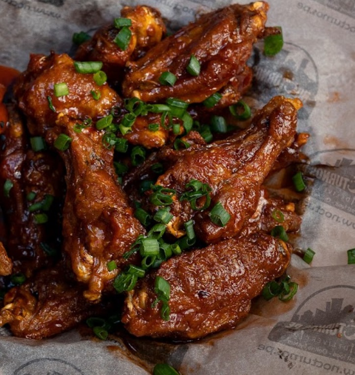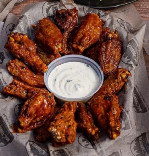 5 Wings acompañadas de papas fritas y cremas de la casa.