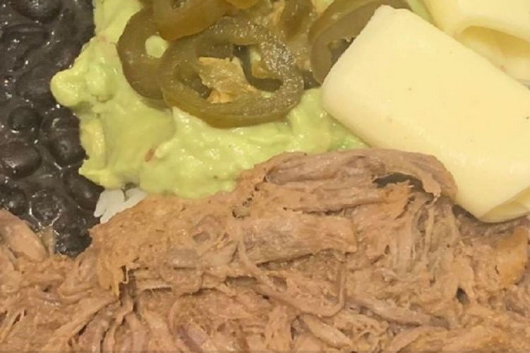 Arroz blanco, guarnición a elegir, carne deshilachada o filete de pechuga a la plancha, queso blanco, guacamole, jalapeño y tortilla de trigo.