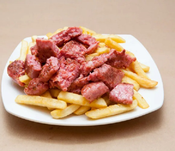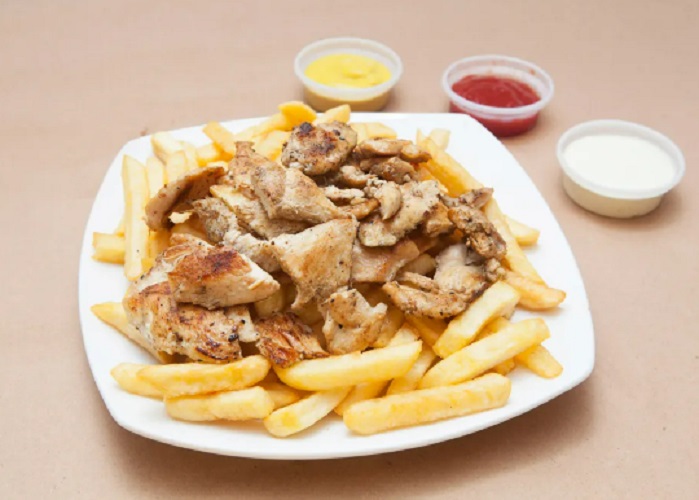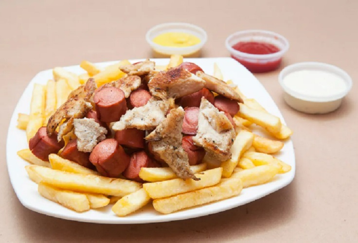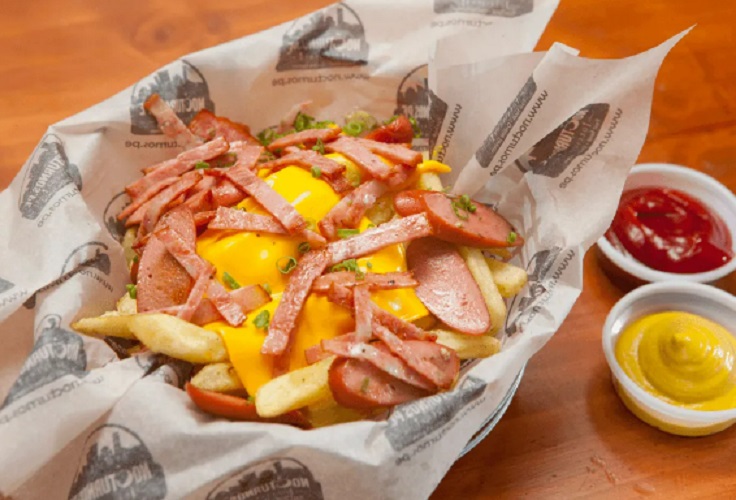 Papas fritas acompañadas de hot dog Frankfurter, chorizo o pollo en trozos.