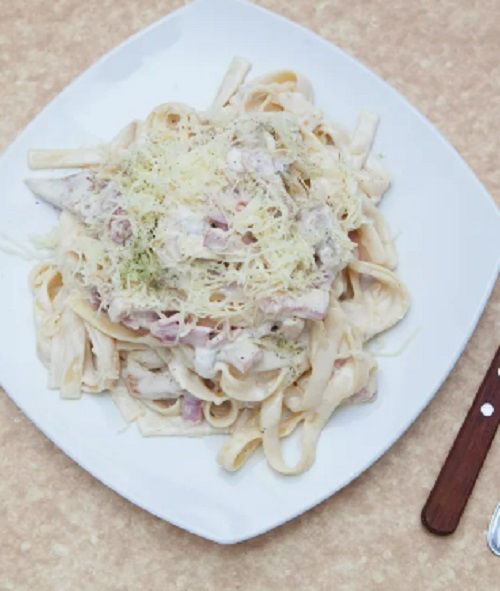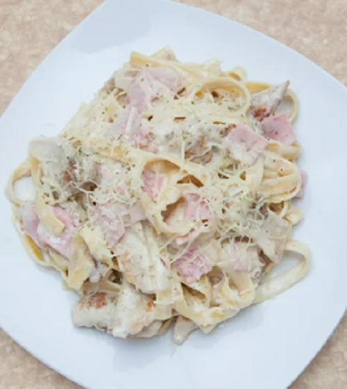 Fina pasta con cremosa salsa Alfredo, queso mozzarella y jamón.