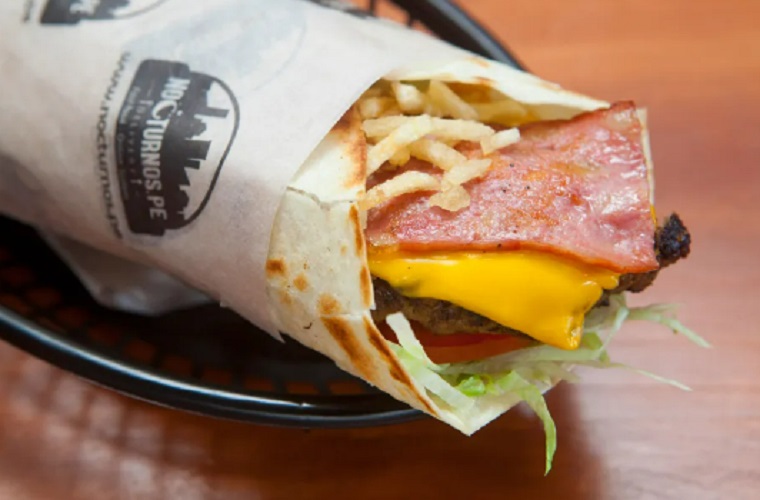 Hamburguesa artesanal, papas al hilo, doble queso blanco o cheddar, queso crema, tocino, salsa BBQ, lechuga y tomate envueltos en tortilla de harina de trigo.
