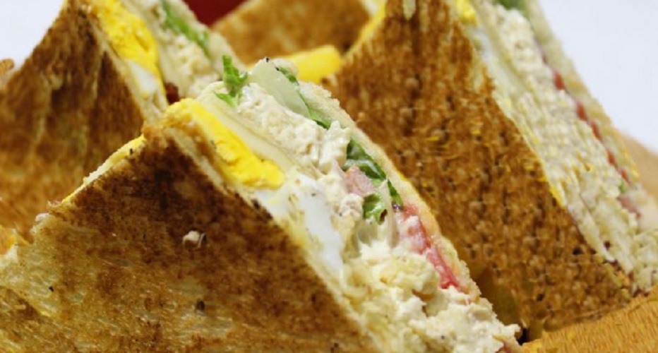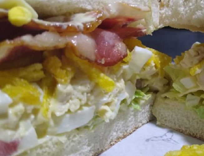 Pan de molde grande con pollo deshilachado, mayonesa, tocino, tomate, lechuga y queso blanco con huevo frito.