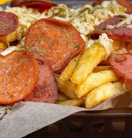 Papas crocantes y hot dog Frankfurt acompañado de pepperoni, salami, queso mozzarella y orégano.