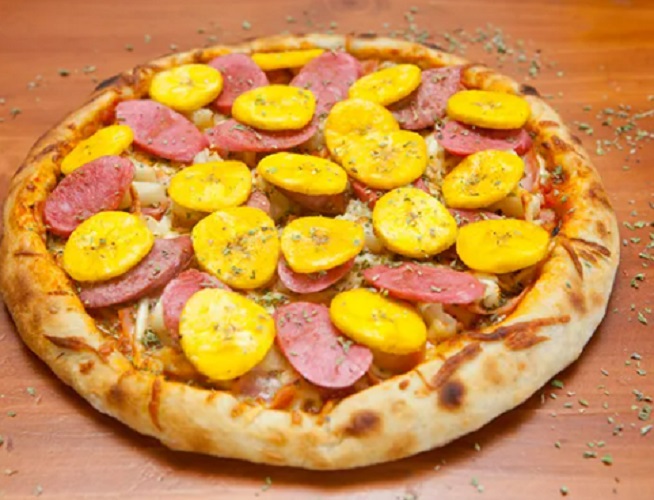 Deliciosa salsa de tomate, queso mozzarella, tocino, plátano frito y huevos fritos.