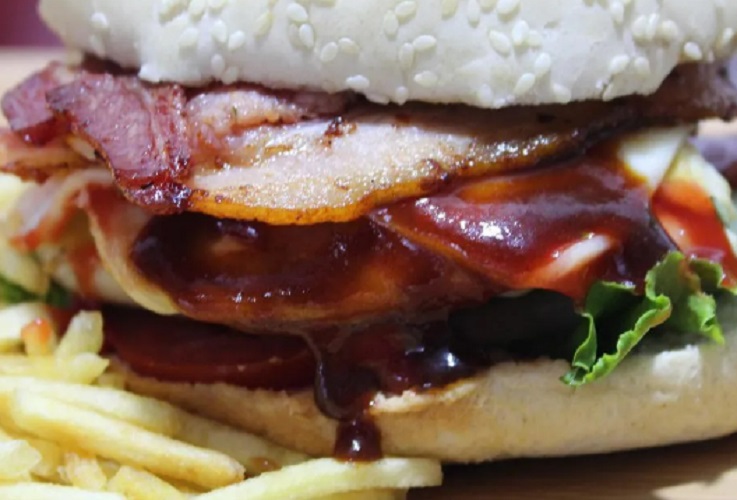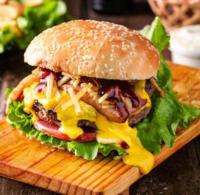 Pan hamburguesa, hamburguesa de la casa 200g bañada en salsa BBQ, queso cheddar o blanco, tocino y papas al hilo acompañado de lechuga, tomate y cremas a elección.